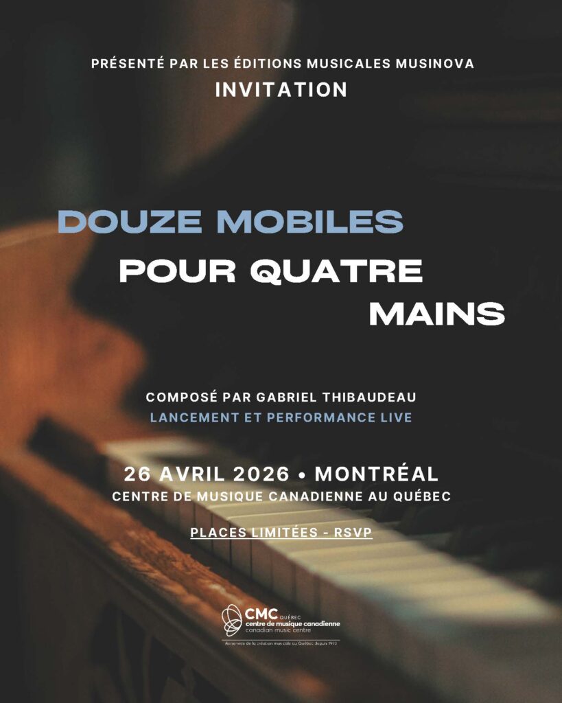 Dimanche 26 avril 2026 à 15 h sera le lancement du recueil « Douze mobiles pour quatre mains », réalisé par le compositeur, pianiste et chef d’orchestre québécois Gabriel Thibaudeau.